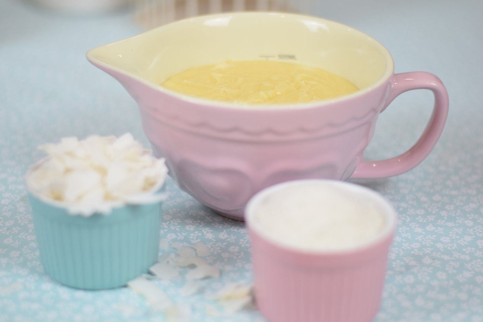 ✿ Na batedeira, coloque o açúcar e o óleo e misture por alguns segundos, junte os ovos, mexa até misturar e então adicione o leite de coco e o coco ralado, misture.